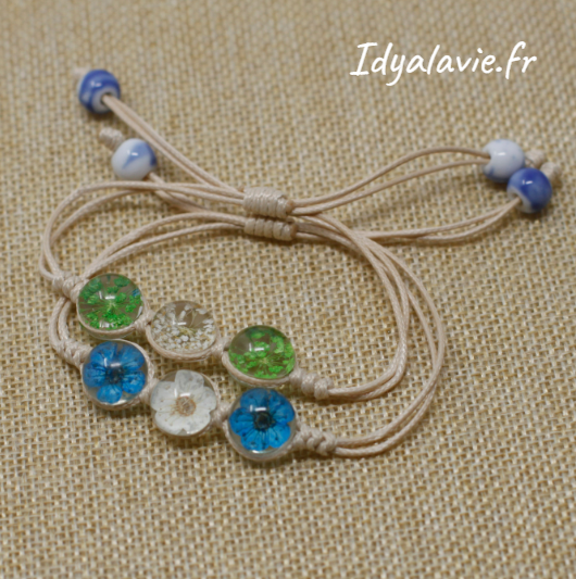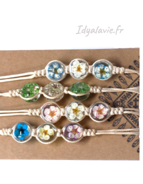 Cette gamme de bracelets en Fleurs pressées est fabriquée avec des fleurs véritables parfois teintées et pressées dans un morceau de verre.