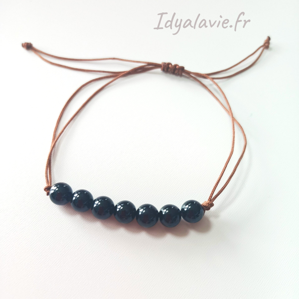 Fin et discret bracelet ajustable composé de 7 fines perles de tourmaline noire de diamètre 6 mm finition polie.