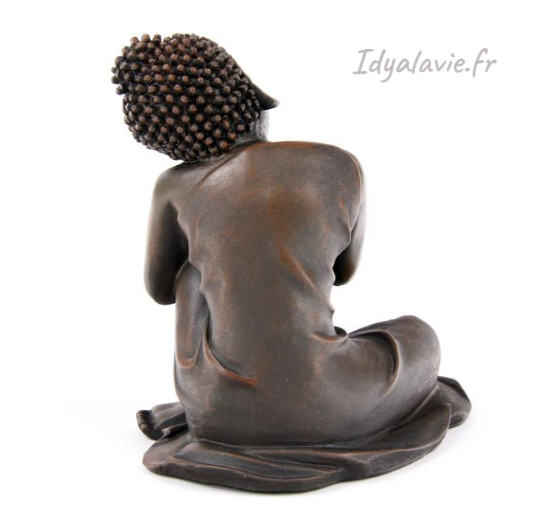 Cette statue en résine représente Bouddha assis, la tête penchée en appui sur son genou.